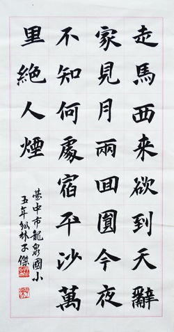 ![]() 11歲 張絲貽 主題:七言絕句一首 尺寸:35X66cm | ![]() 11歲 張軒銘 主題:詩一首 尺寸:35X66cm | ![]() 11歲 李翼全 主題:詩一首 尺寸:35X66cm |
